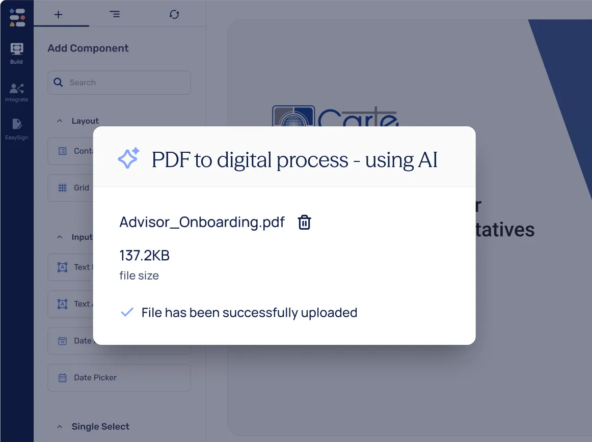 Carte Financial Group replaced paperwork and static Google Forms with smart digital workflows, enabling a lean team to quickly build and launch compliant processes with EasySend’s AI PDF Converter, including advisor onboarding, compliance, billing, and internal operations.