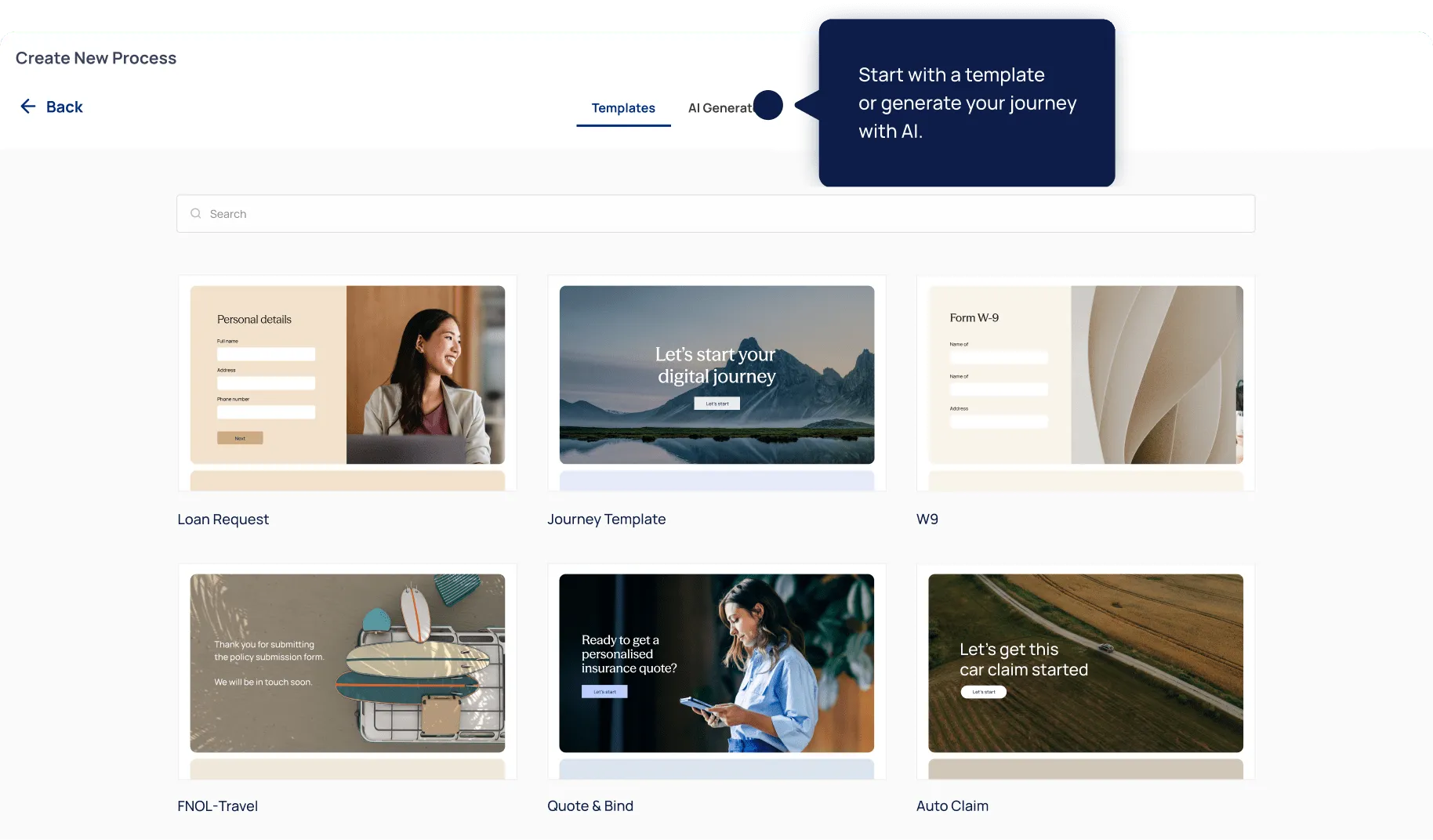 Build digital journeys that streamline customer data intake with multi-step forms, multi-participant flows, advanced routing, e-sign.