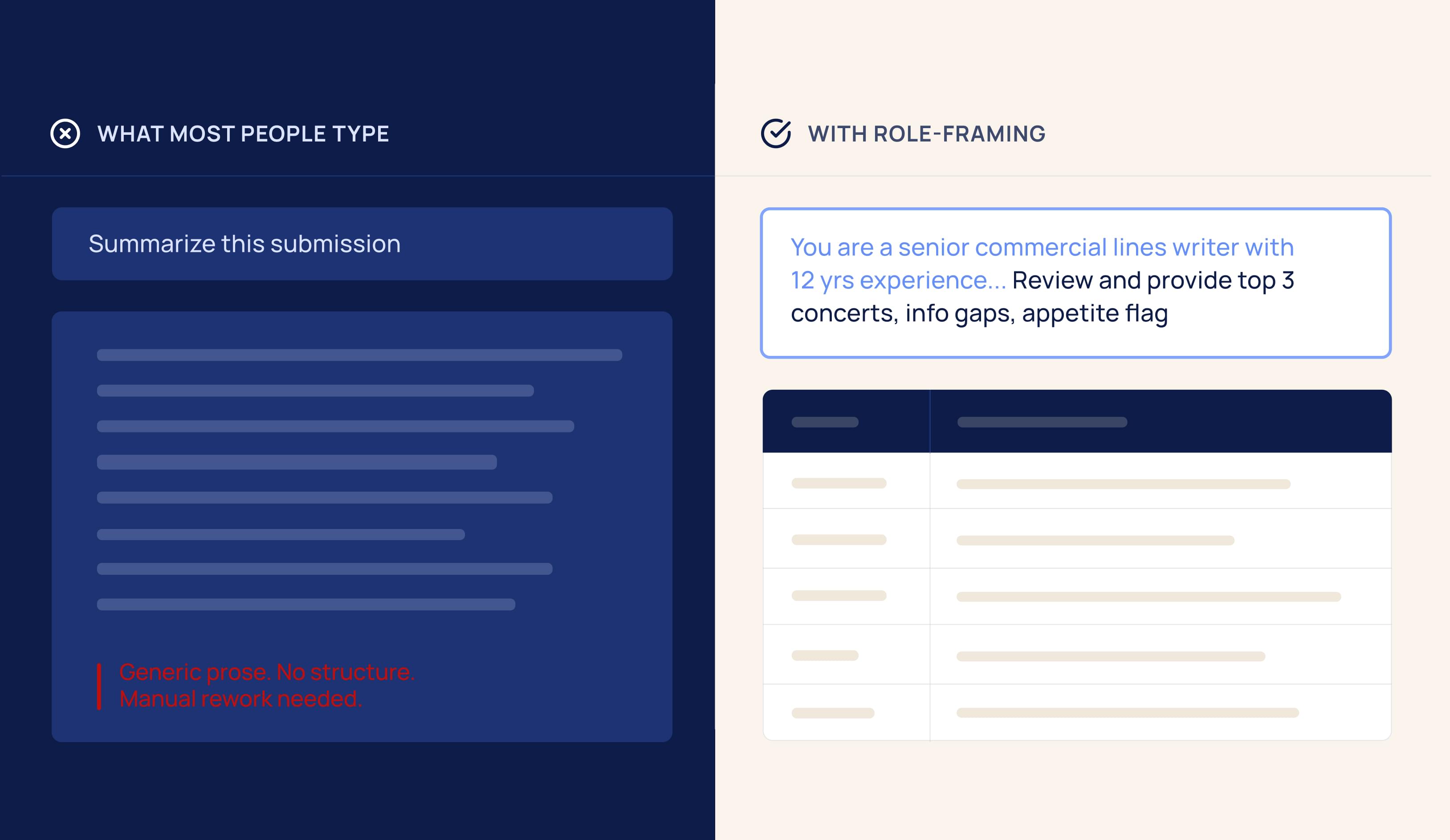 Insurance is domain-specific. The difference between a generic analysis and a genuinely useful one is whether the AI reasons from general knowledge or from real insurance expertise. A role-framed underwriting prompt produces outputs that reference loss ratio logic, schedule credits, and risk appetite language. A claims prompt activates coverage form knowledge, exclusion analysis, and the habit of flagging rather than concluding
