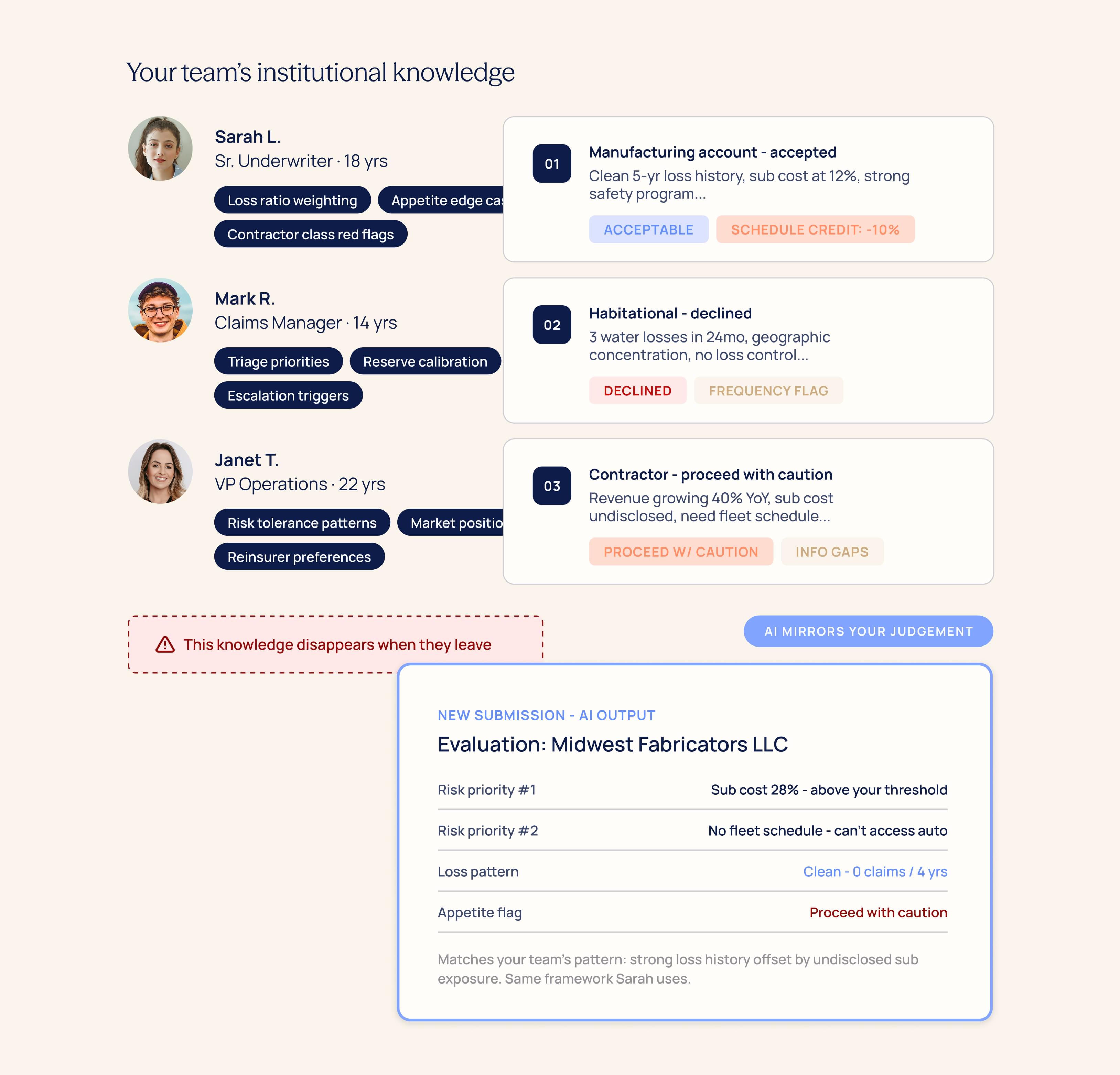 Every carrier has institutional knowledge that lives nowhere except in the heads of senior staff. How your best underwriter evaluates a habitational risk differently from a contractor risk. What your claims team flags versus what they let pass. The judgment calls that take years to develop — and that disappear when someone retires, transfers, or is simply too busy to review every file.