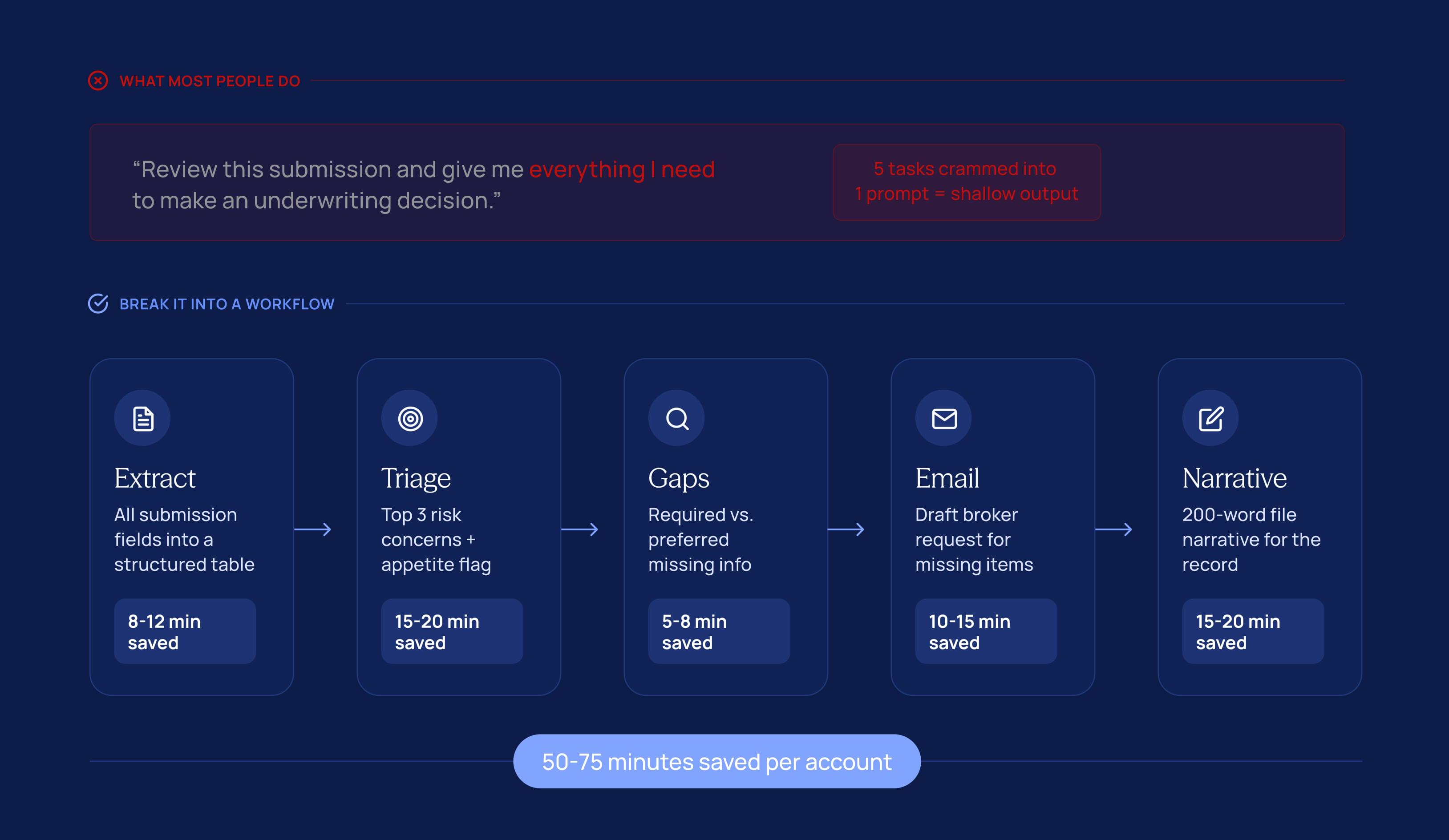 That's where the AI advantage begins. Not in a boardroom strategy session—in a single structured prompt that saves your underwriters 15 minutes on every new submission, or your claims team 20 minutes on every coverage analysis. Then the next prompt. Then the one after that.